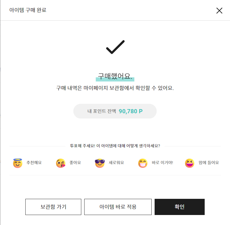 아이템 바로 적용을 눌렀더니 요렇게 바뀌었어요. 저렴하지는 않는 가격이네요 ㅋㅋ