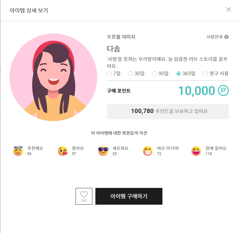 프로필 이미지가 캡쳐한 부분 이외에도 다양하게 준비되어 있는데요. 프로필 이미지는 개당 10000포인트입니다.