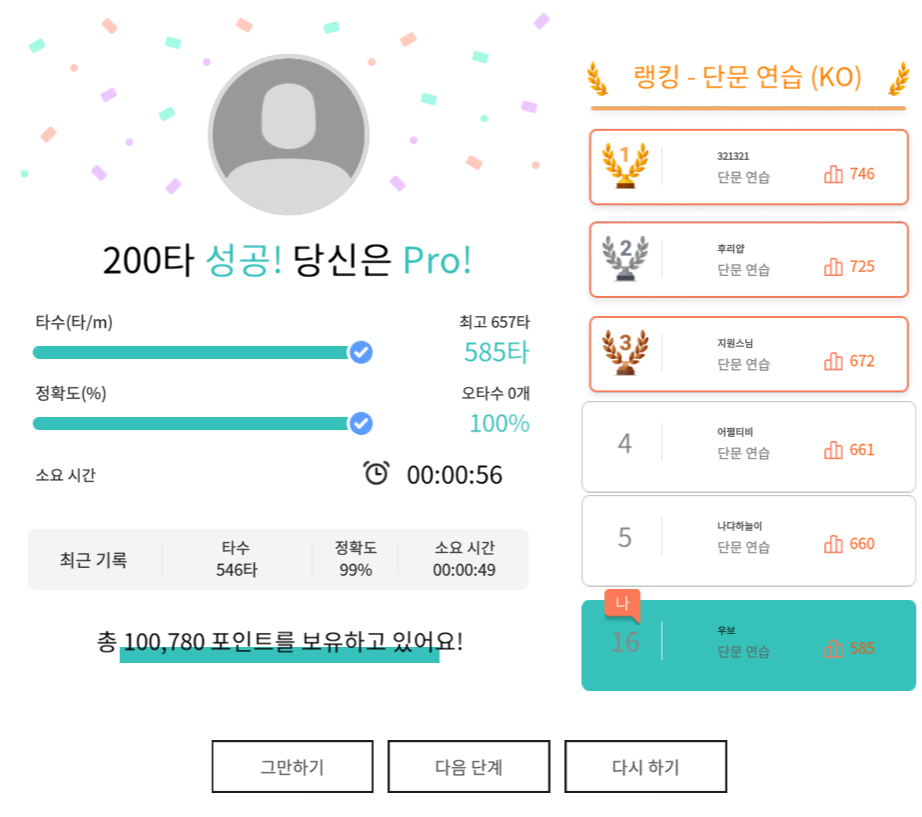 는 어릴때 게임 같은어서 한컴타자를 게임처럼 했었어요. 너무너무 재미있어서 매일매일 어제의 나를 이기기 위해서 속도와 정확성을 올리기위해 싸우며 연습을 했던 것 같아요. 그래서 정확하고 빠른 속도로 타자를 할 수 있는 편이예요. ^^