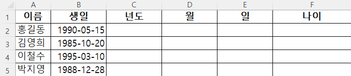 YEAR(serial_number), MONTH(serial_number), DAY(serial_number): 주어진 날짜에서 연도, 월, 일을 추출합니다. serial_number는 날짜 값을 나타내는 다른 함수나 셀 참조일 수 있습니다.