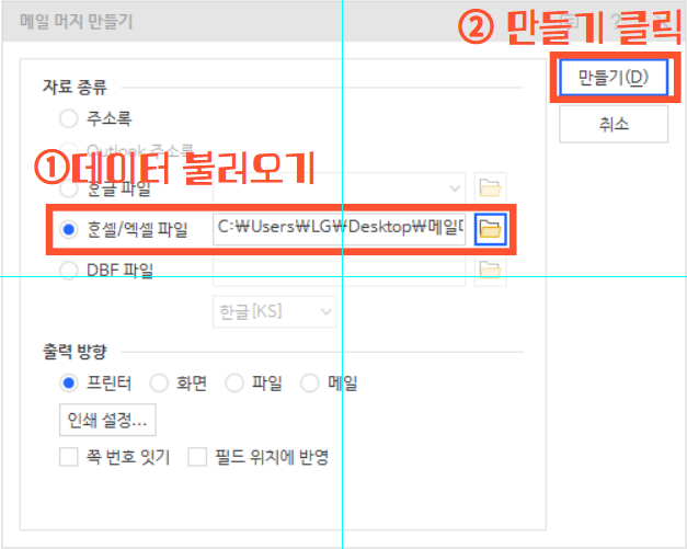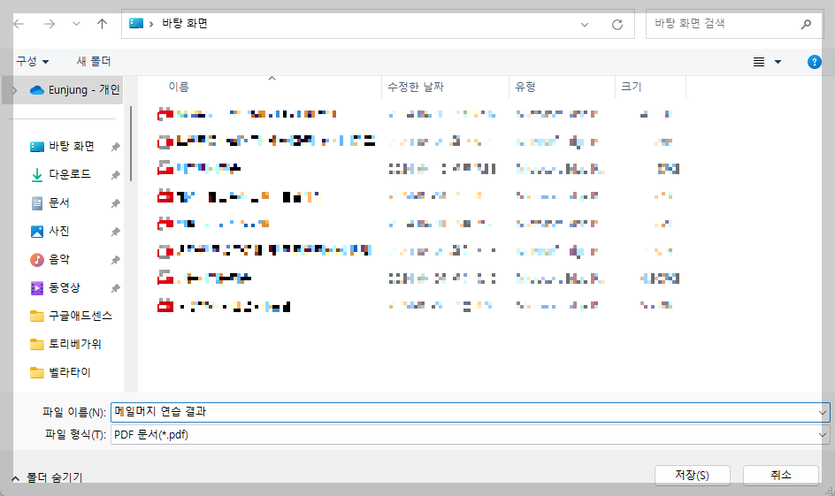 그리고, 출력방향을 선택해줄 수 있습니다. 프린터를 바로 할 것인지, 화면으로 볼 것인지, 파일로 저장을 할 것인지, 메일로 발송을 할 것인지... 등등을 선택해주시면 되요. 저는 프린트를 PDF저장으로 설정을 해 놔서 저장할 수 있도록 대화창이 나왔습니다. 저는 메일머지 연습결과라고 입력했습니다. 메일머지용으로 작성한 파일은 변화가 없어요. 반복해서 계속 사용할 수 있도록 작성한 그대로 있구요.