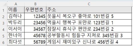 저는 이렇게 간단하게 다섯명의 정보를 적어보았습니다. 주소는 재미있게 적어보려고 만들었어요. 이제 이 자료를 한글로 불러와서 제 자리에 들어가도록 작성을 해주면 되는데요. 엑셀에 작성된 자료를 저장해주세요. 저장위치와 이름을 한글에서 찾아서 열어야 하니, 꼭 확인 하시구요~~