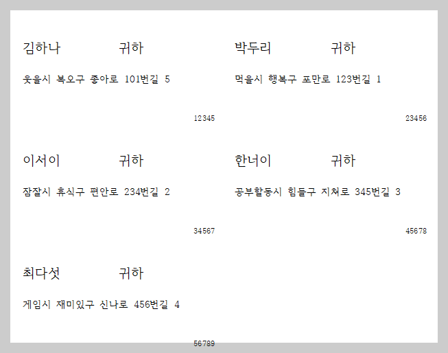 이렇게 작성이 되었습니다. 테두리가 안보이지만, 원래 맞는 라벨지를 선택해서 작성하기 때문에, 프린트될 용지에 맞춰서 작성하시면, 칼선으로 구분이 될 것입니다.