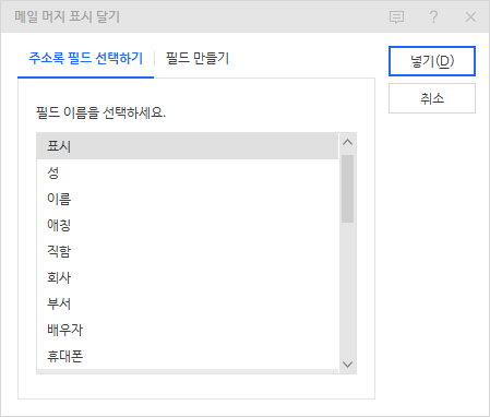 만약 주소록 필드 선택하기에 내가 원하는 제목이 없다면, 오른쪽 [필드 만들기] 탭으로 이동하셔서 직접 입력해 주시면 됩니다.