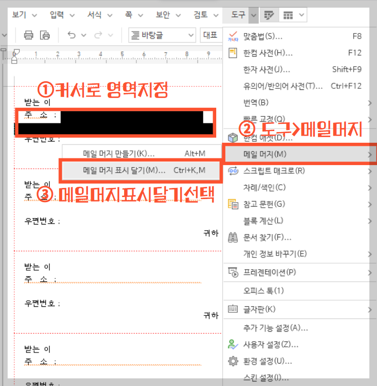 내용이 들어갈 곳에 이렇게 블럭으로 영역을 지정해준 후에, [도구]탭에 들어가서 [메일머지]를 선택하고, [메일머지 표시달기]를 선택합니다.