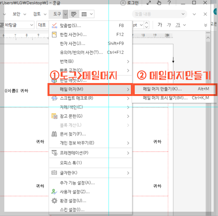 이제 한글파일로 돌아와서 한글머지 만들기를 할꺼예요. 다시 [도구]> [메일머지]로 들어가셔서 이번에는 [메일머지 만들기]를 선택해주세요.