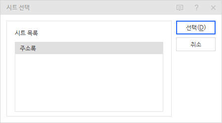 그러면 어떤 시트에서 가져올 것인지를 한 번더 선택을 해주셔야 해요. 엑셀파일은 여러개의 시트를 한 파일에 만들 수 있으니까요. 저는 주소록이라고 시트명을 입력해놔서 시트가 하나라서 하나밖에 안 뜨네요. 해당 시트의 이름을 클릭하고 선택을 눌러줍니다.