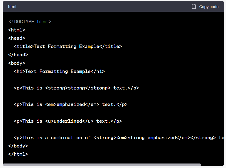 HTML에서는 <strong>, <em>, <u>태그를 사용해서 텍스트 서식을 지정할 수 있습니다.